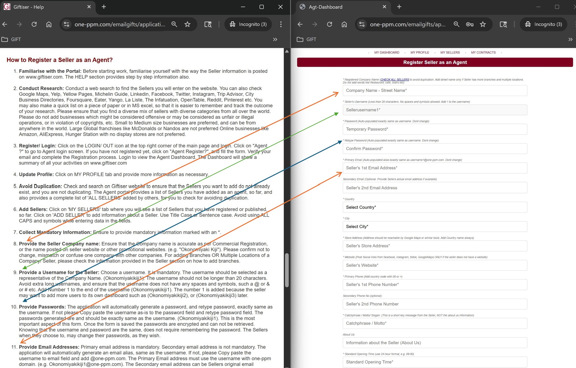 - Avoid Duplication: Check and search on Giftiser website to ensure that the Sellers you want to add do not already exist, and you are not duplicating. The Agent portal provides a list of Sellers you have added as an agent, so far, and also provides a complete list of 'ALL SELLERS' added by others, for you to check for avoiding duplication.